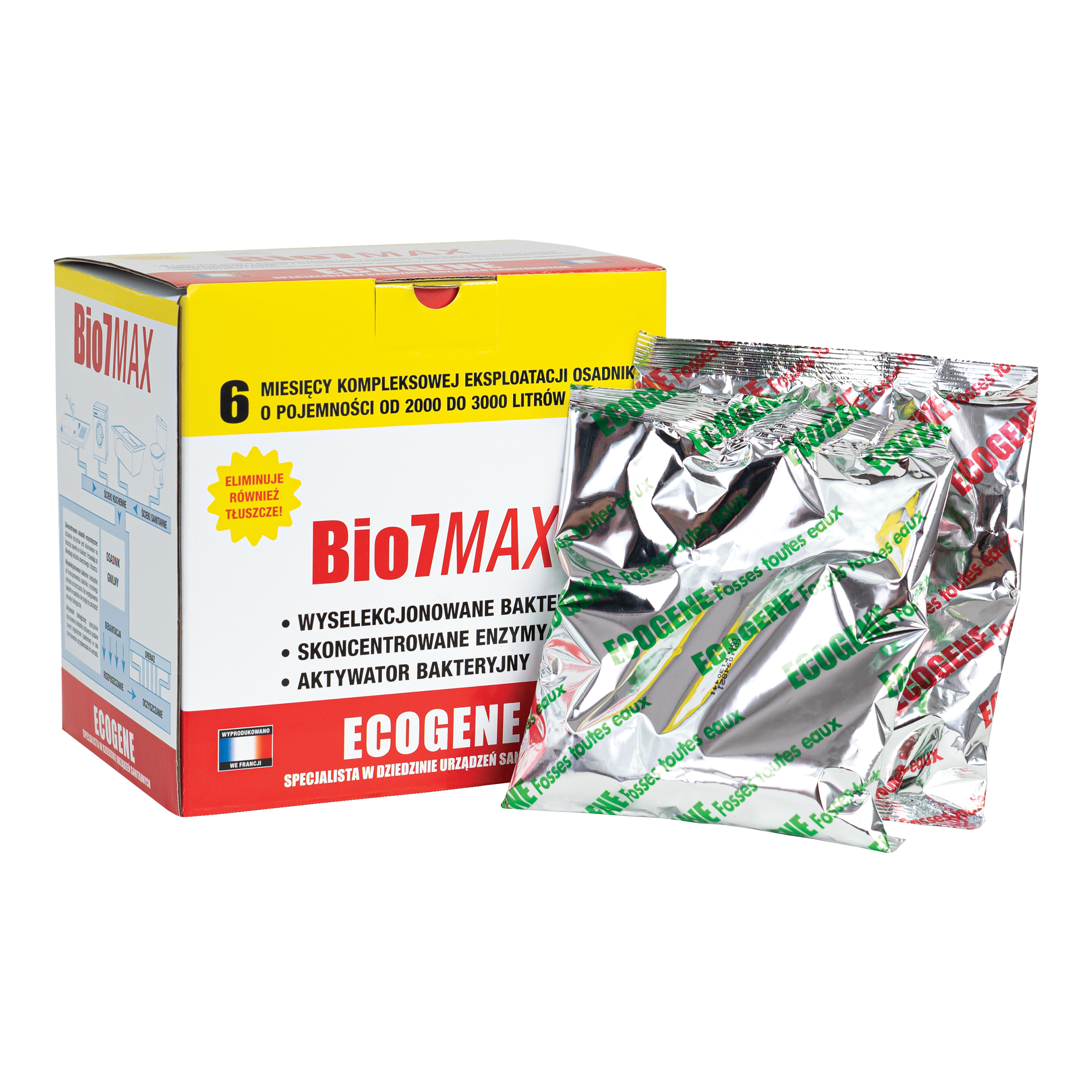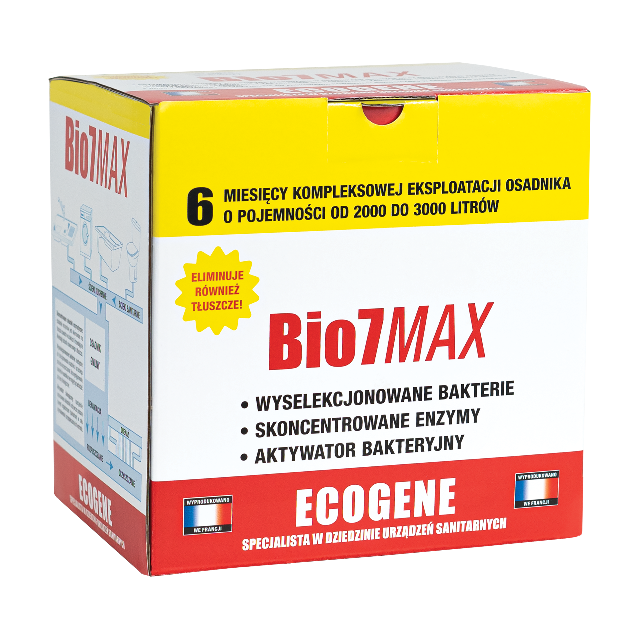 BIO7 MAX to biopreparat dwufazowy, przeznaczony w szczególności do instalacji nie wyposażonych w separator tłuszczu. Biopreparat eksploatacyjny został dodatkowo wzbogacony o wyselekcjonowane bakterie i enzymy rozkładające tłuszcze. Specjalna receptura 2w1 opracowana została tak, aby jeszcze bardziej poprawić pracę oczyszczalni ścieków poprzez wyeliminowanie problemu zatłuszczenia instalacji. Składniki preparatu zapobiegają powstawaniu tzw. „kożucha tłuszczowego” oraz chronią przed zatorami tłuszczowymi elementy funkcjonalne instalacji (rury, przepompownie, drenaże, studnie chłonne).