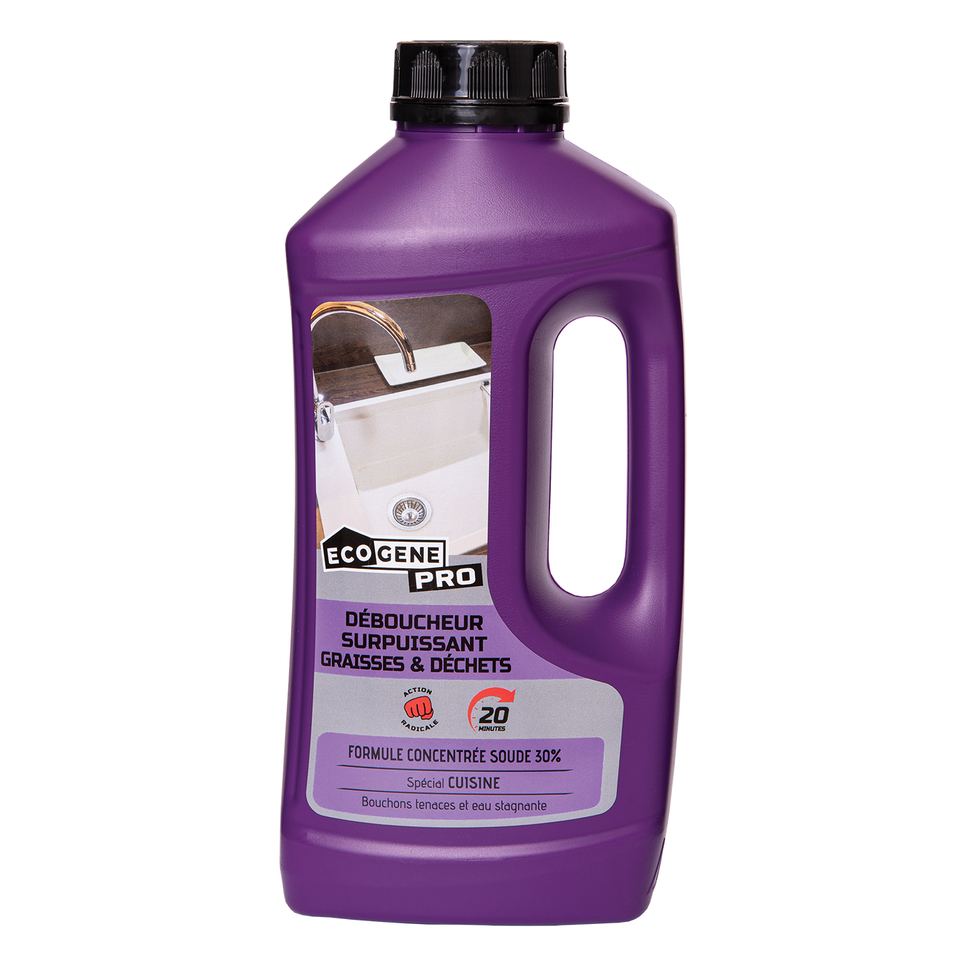 ECOGENE PRO Udrażniacz Kuchnia STRONG 1L to silny środek do udrożniania rur. Dzięki skoncentrowanej formule zawierającej 30% sody, radykalnie usuwa nagromadzony tłuszcz, resztki jedzenia i osady mydlane odpowiedzialne za zatykanie zlewu. Jest specjalnie opracowany, aby zwalczać uporczywe zatory i działać głęboko, nawet w przypadku stojącej wody w rurach kuchennych.