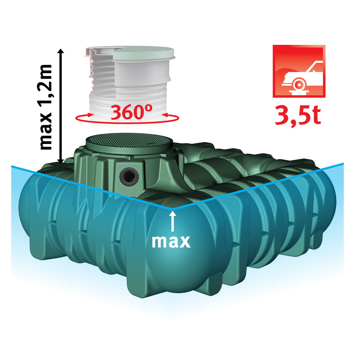 - Zagłębienie do 1,2 - Głęboka instalacja zwiększa elastyczność montażu – zwłaszcza na działkach o ograniczonej przestrzeni (120 cm to maksymalny dopuszczalny naziom nad zbiornikiem z dwoma dodatkowymi nadbudowami i nadstawką oraz pokrywą z tworzywa sztucznego – wyłącznie w terenach zielonych)
