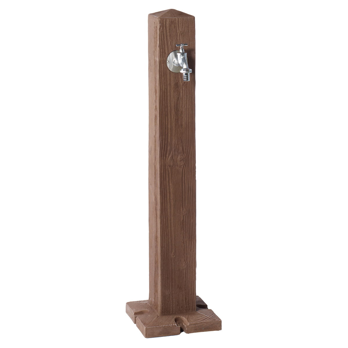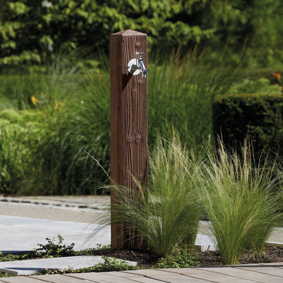 Ogrodowy punkt poboru wody wykonany z wysokiej jakości tworzywa sztucznego imitującego drewno.
