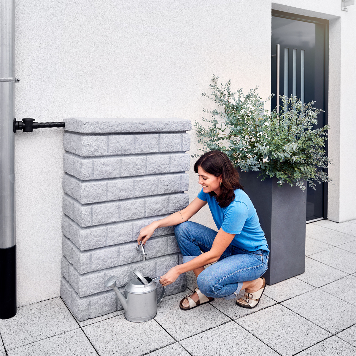 - W celu magazynowania wody deszczowej w zbiorniku niezbędny jest łapacz wody montowany w rurze spustowej, np. Zbieracz wody Speedy