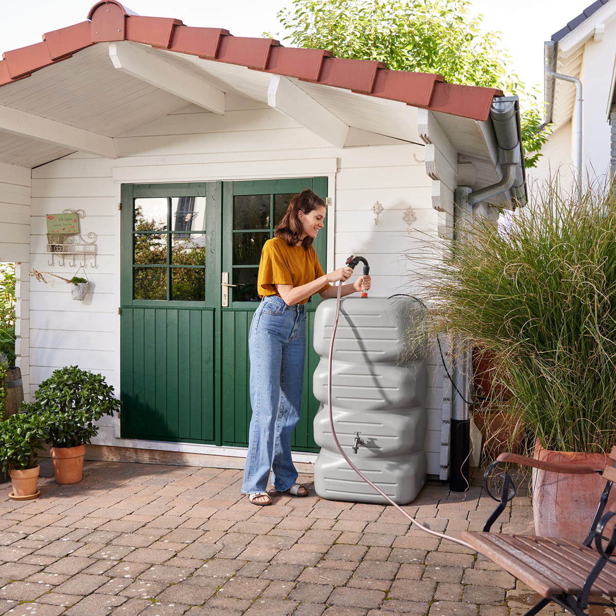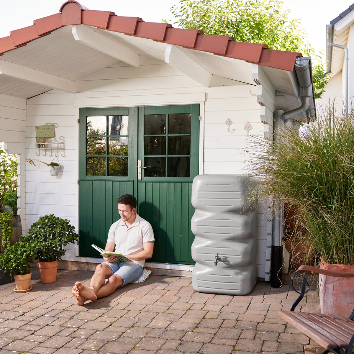 Zbiornik na deszczówkę Cubus o pojemności 340 litrów w kolorze betonowoszarym.