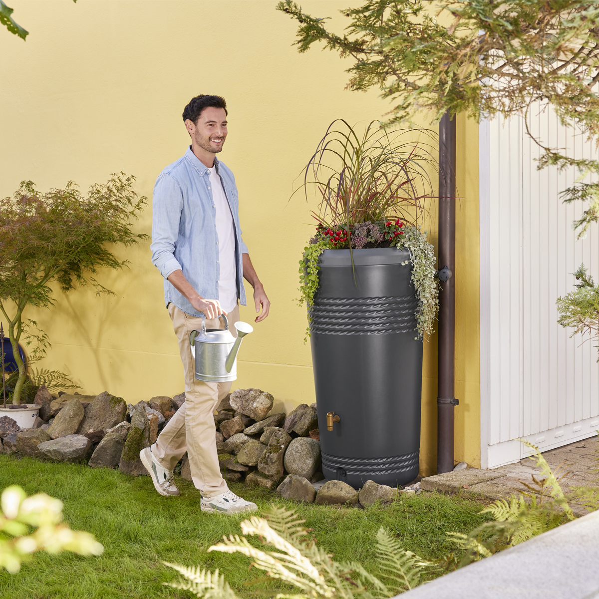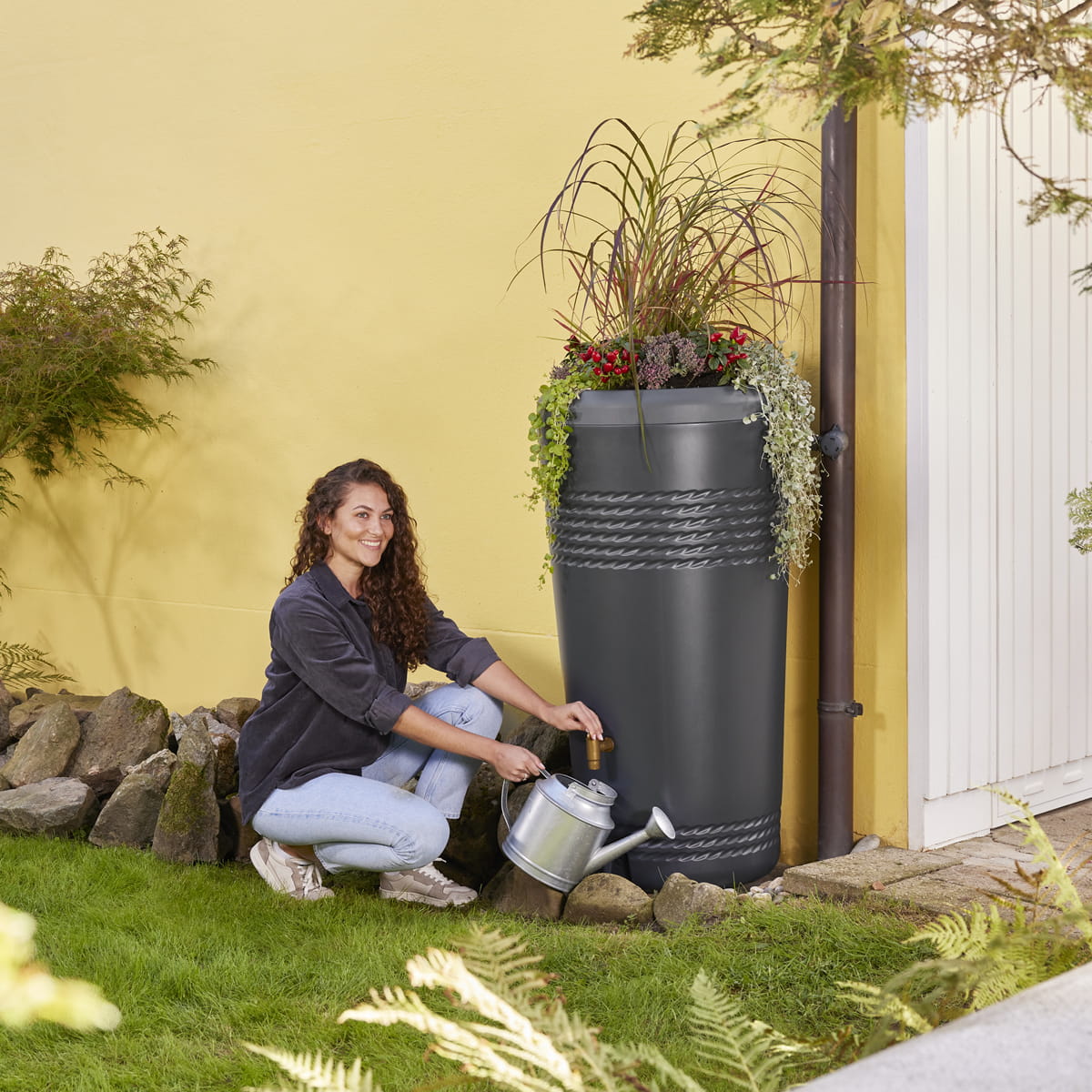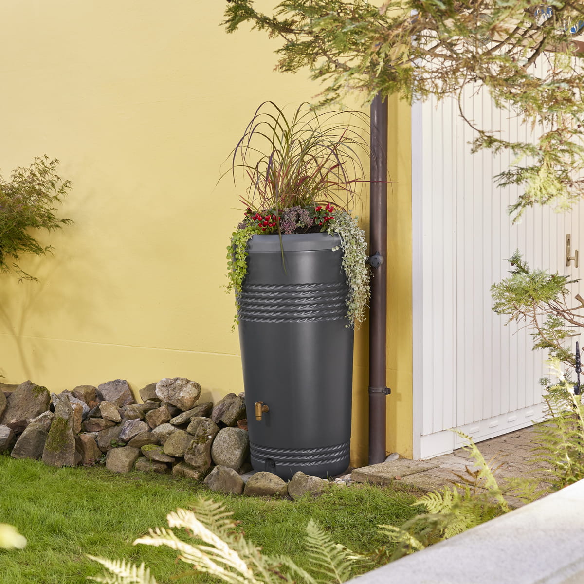 Naziemny zbiornik na deszczówkę Milo 2w1 w zestawie z donicą na kwiaty oraz kranem Aqua-Quick. Pojemność zbiornika to 230 litrów.