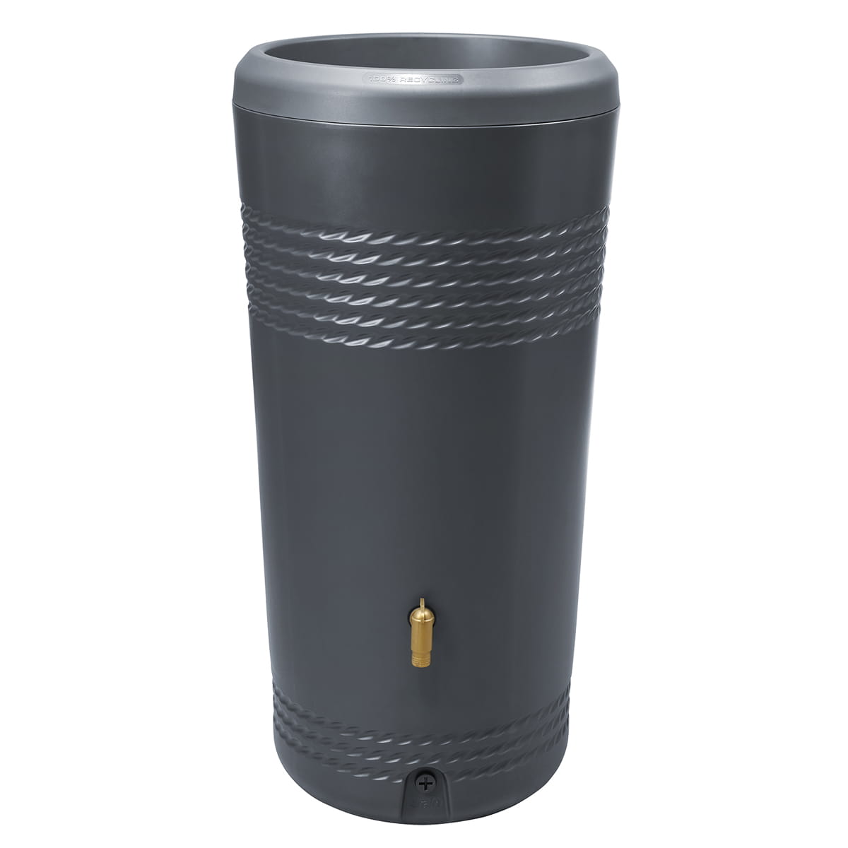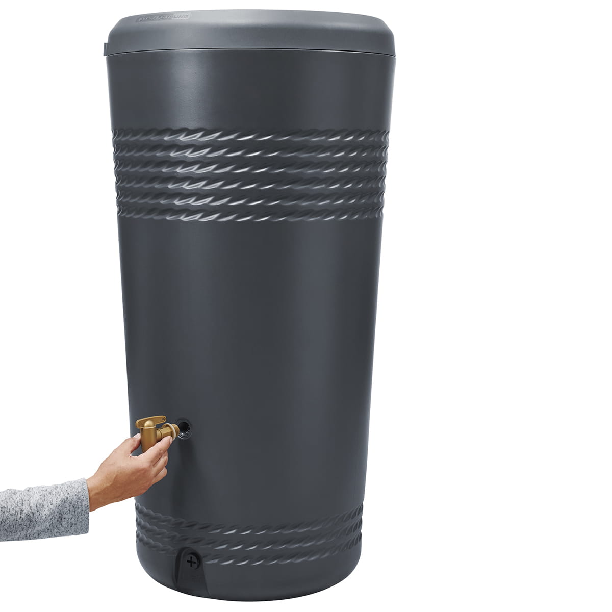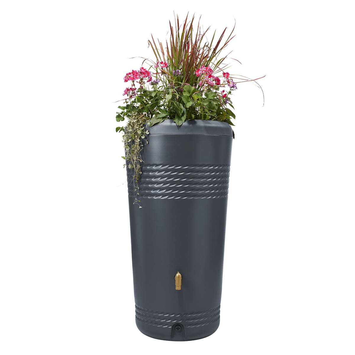 Naziemny zbiornik na deszczówkę Milo 2w1 w zestawie z donicą na kwiaty oraz kranem Aqua-Quick. Pojemność zbiornika to 230 litrów.